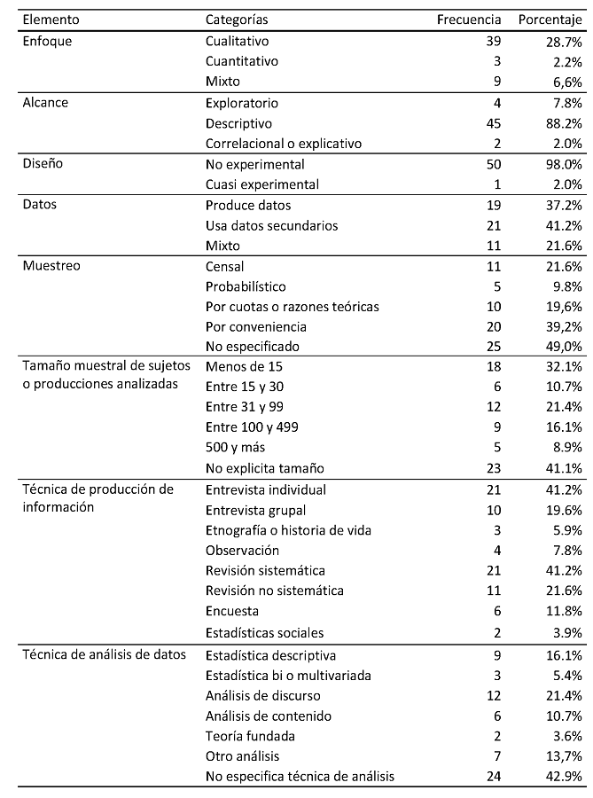 Finalmente, con relación al método de las investigaciones, estas también parecieran dar cuenta de un campo que no tendría la complejidad requerida para insertarse en los circuitos internacionales de producción científica dominantes. La mayor complejización se observa en estudios cualitativos en que se utilizan técnicas de análisis más complejas, como el análisis de discurso. Sin embargo, estos trabajos presentan otras debilidades, como no especificar y/o justificar el tamaño muestral, la técnica de muestreo o de producción de datos, entre otros. Creemos que esto podría indicar que una parte de la comunidad académica dispone solo parcialmente de las herramientas sistemáticas para realizar investigación empírica tal como se exige actualmente en los circuitos internacionales o que la premura por publicar incentivó la realización de investigaciones con menor nivel de complejidad.