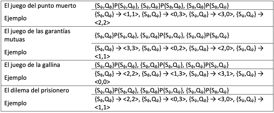 Donde {S,Q} es el conjunto de jugadores, {φ,ψ} es el conjunto de estrategias y <x,y> son pagos (nótese que es un par ordenado de modo que x corresponde a un jugador e y corresponde al otro). Los pagos son las consecuencias de la intersección de las estrategias de los jugadores. Así pues, convencionalmente la expresión “{Sφ,Qφ} → <x,y>” denota que el conjunto de estrategias {Sφ,Qφ} produce como consecuencia el par <x,y>, tal que x es el pago para S e y es el pago para Q. Los pagos son los estados de cosas que dependen de las acciones o estrategias de los jugadores. Este esquema permite formalizar diferentes situaciones o tipos de juegos en función de la relación de los pagos establecidos para cada par de estrategias. Es particularmente relevante observar que el pago ya está establecido en las propias reglas del juego. No se trata de contenidos mentales de los agentes, sino de un orden de preferencias ya establecido en la propia dinámica de un juego en cuestión. Si simplificamos los resultados de modo simétrico entre los pagos para cada jugador, entonces se generan veinticuatro modelos. Por lo tanto, en la mitad de los modelos {Sφ,Qφ}P{Sφ,Qψ} y en la otra mitad {Sψ,Qφ}P{Sψ,Qψ}. Los modelos más destacados son: [ Tabla 1 ]