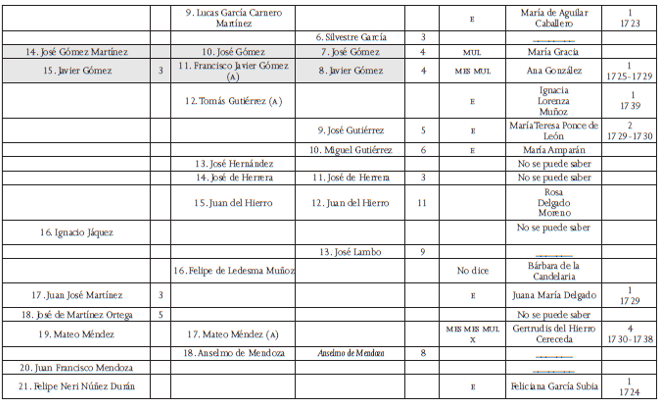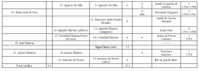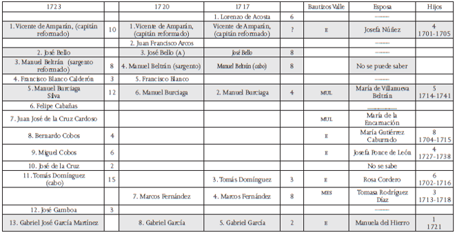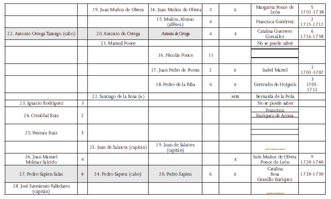 E: español o española; mul: mulato o mulata; mes: mestizo o mestiza; x: no se indica la calidad (19 soldados tuvieron hijos españoles o son calificados de españoles, 8 pertenecían a las castas, en los demás casos no se indica la calidad). La frase “No se puede saber” indica que existen homónimos y que, por lo tanto, resultaba imposible determinar quién de estos era el soldado de la compañía volante. En gris se marcan los nombres de los soldados que aparecen en las tres listas. En 1717 se empadronaron los soldados dos veces, el 8 de agosto y el 20 de octubre. En la segunda lista se anotan los soldados ausentes en la primera, cuyos nombres se señalan en cursivas.