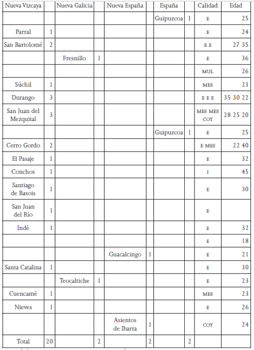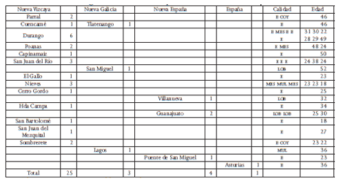 En los padrones de la compañía volante de 1717, 1720 y 1723 no aparece el origen geográfico de los soldados ni su calidad, datos que sí se señalan en los de Mapimí y El Gallo, de 1717 (véase anexos 3 y 4),[26] pero el origen de los de la compañía volante tuvo que haber sido semejante. La mayoría provenía de la Nueva Vizcaya, varios habían nacido en la capital de la gobernación, y unos cuantos eran oriundos de algún presidio, siempre distinto a donde ejercían su oficio. Un hijo de Miguel Gutiérrez, soldado de la compañía volante en 1717, contrajo matrimonio con una mujer originaria de El Gallo, lo cual muestra la relación entre los miembros de los presidios, que aparece de manera clara en los padrones de Mapimí y de El Gallo. Unos cuantos provenían de la Nueva España o de la Nueva Galicia (de poblados cercanos a Zacatecas).