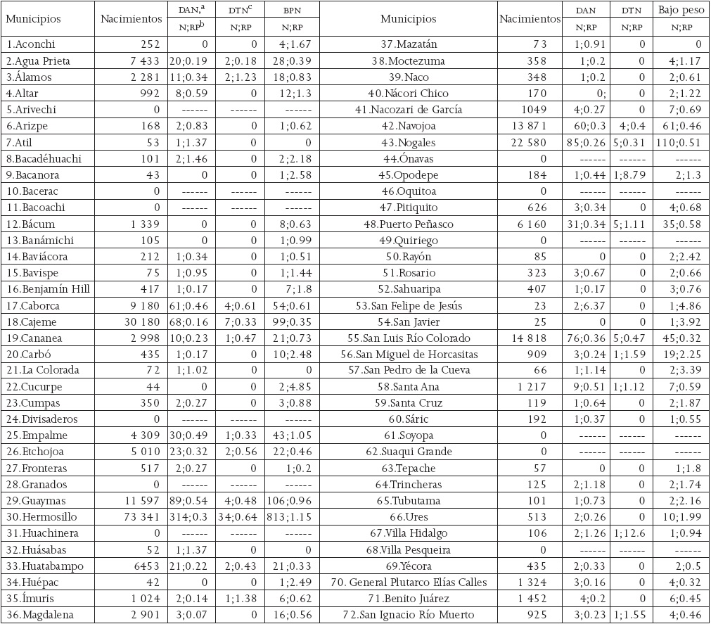 En Sonora se registraron 84 DAN en el periodo estudiado, 8.55 por ciento del total de los dan en la entidad y 65.62 del subgrupo específico, con una tasa bruta de 0.36 por cada mil nacimientos. Del total de DAN, se reportaron 64 casos de anencefalia (76.19 por ciento), 16 de espina bífida (19.05) y 4 de encefalocele (4.76). De 69 con DAN (82.1 por ciento) con datos de localidad, 85.51 ocurrió en zonas urbanas. Los problemas de DAN, DTN y BPN se concentran en las ciudades.