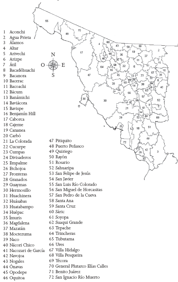 El estado de Sonora se localiza al noroeste de México, limita al Norte con Estados Unidos, y tiene 72 municipios (véase Figura 1); en 2010 contaba con 2 662 480 habitantes, y ocupaba el sitio 17 en tamaño poblacional entre las 32 entidades federativas. Su economía, vinculada al país vecino, dispone de una infraestructura productiva próspera en los sectores agropecuario, industrial y comercial; su desarrollo socioeconómico es alto, y su población vive con estándares de bienestar satisfactorios.