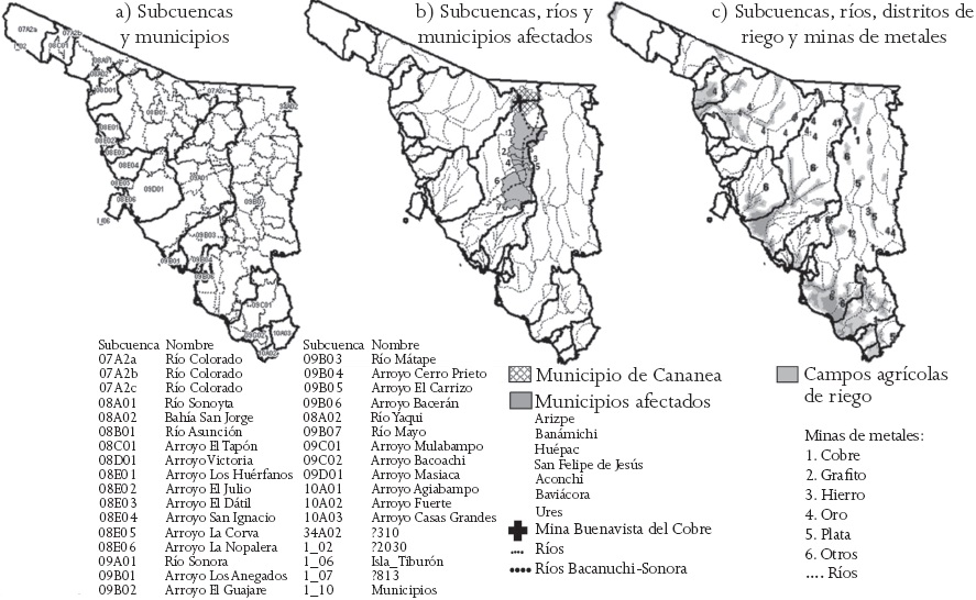 La información georreferenciada de los límites nacional, estatal, localidad, ríos y distritos de riego se obtuvo del INEGI (2015a; 2015b); a los distritos de riego se les añadió un sombreado tenue de cuatro kilómetros para amplificar su visualización. Los datos georreferenciados de minas de metales se consiguieron a través del Directorio estadístico nacional de unidades económicas del INEGI (2015c), y se confrontaron con la información estatal (Secretaría de Economía del estado de Sonora 2010). Las delimitaciones naturales de subcuencas hidrológicas de Sonora se tomaron del INECC (Cotler-Ávalos 2004).