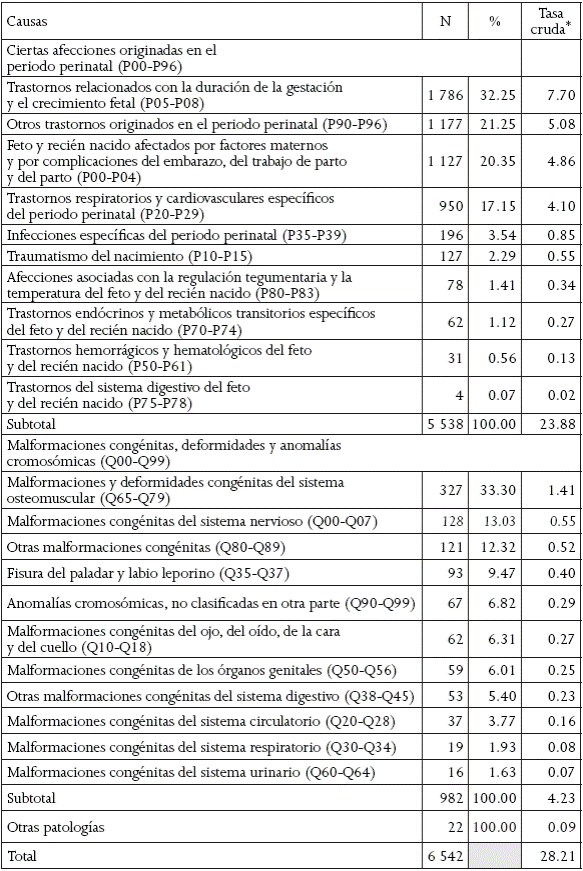 En 6 542 nacimientos se registró al menos una enfermedad, con una tasa bruta de 28.21 por mil (véase Figura 3). De este total, 5 538 correspondieron a las afecciones originadas en el periodo perinatal (84.65 por ciento), y 982 al de malformaciones congénitas, deformidades y anomalías cromosómicas o DAN (15.01), con una tasa bruta de 23.88 y 4.23 por mil nacimientos respectivamente.