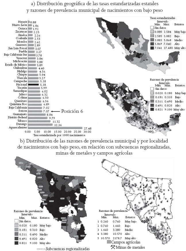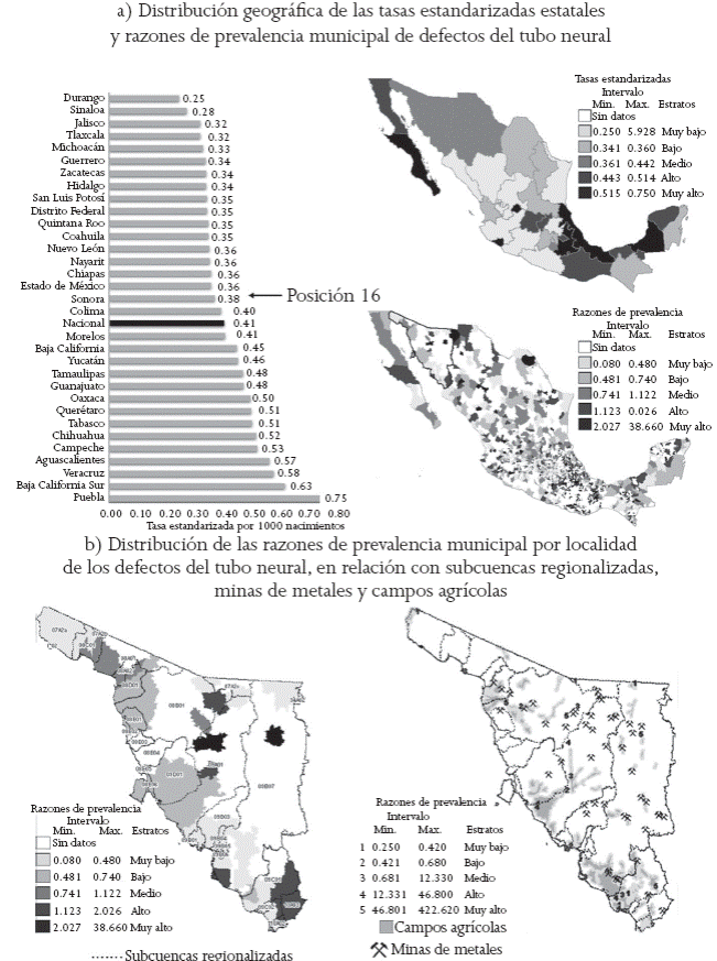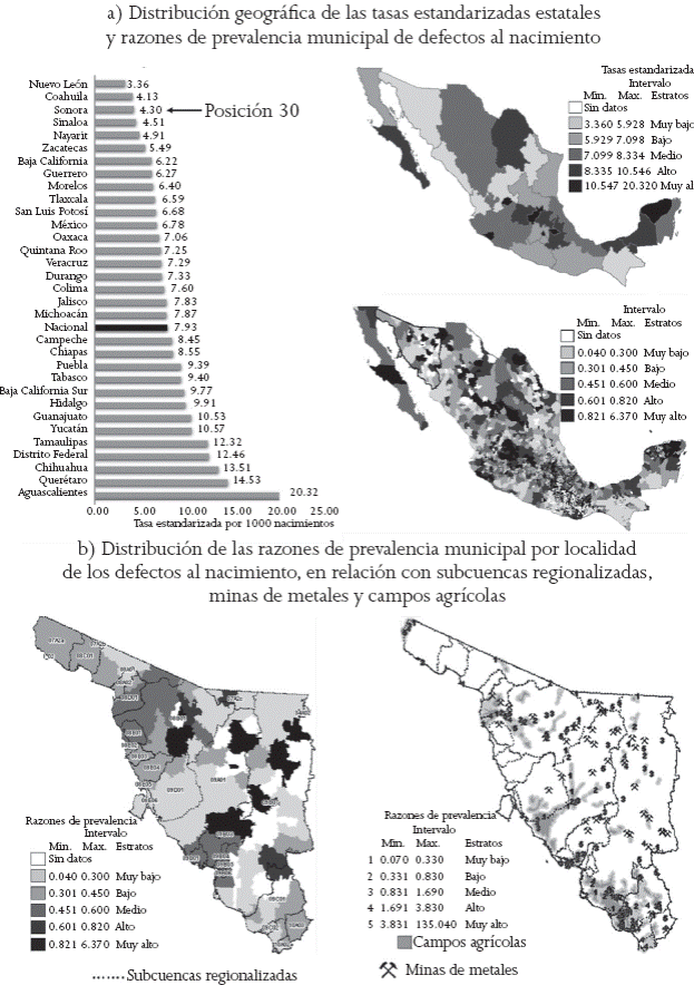 Abstract: There is evidence of environmental contamination due to mines and agricultural fields in Sonora, Mexico. Objective: to spatially study the prevalence of birth defects (bd), neural tube defects (NTD) and low birth weight (LBW) in municipalities in connection with metal mining sites and irrigation districts. Material and methods: databases of birth and stillbirth from 2008 to 2012 were used. Rates of national, state, municipal and local prevalence were estimated. Georeferenced information of the country and, in addition, states cities, rivers, irrigation districts, metal mines and hydrological sub-basins of Sonora was used. Results: prevalences are associated spatially with places where economic activities and environmental pollution problems are concentrated. Conclusions: results suggest the likely influence of environmental pollution in the prevalence of bd, ntd and lbw across the state.