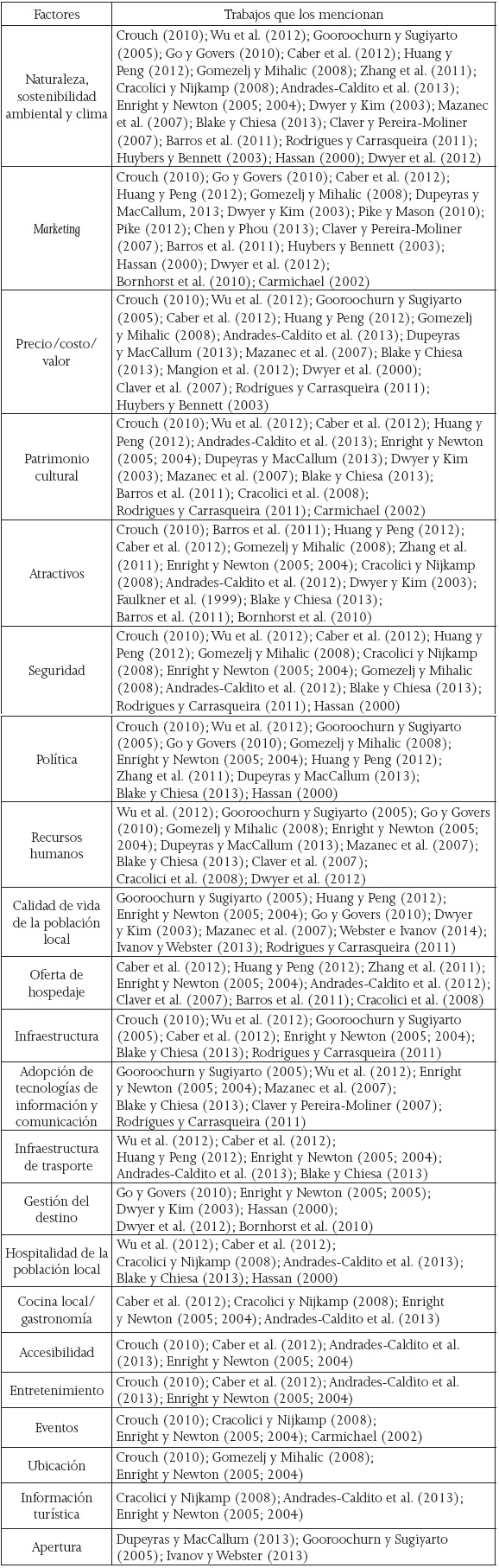 La diversidad de enfoques entre los trabajos revisados dificulta definir con precisión las variables dependientes e independientes de los modelos teóricos. En el anexo se presentan los indicadores que, a juicio de los autores, pueden considerarse representativos de la competitividad de los destinos turísticos. Para lograr el objetivo planteado aquí, se clasificó a las variables en independientes y dependientes; entre las últimas están los indicadores de competitividad, mientras que las independientes son los factores que determinan la competitividad.