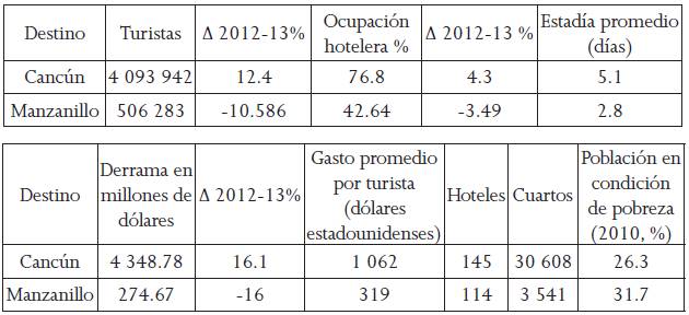Cancún deja atrás a Manzanillo en todos los indicadores de competitividad turística propuestos en la literatura académica, tanto en términos absolutos como en tendencias e indicadores sociodemográficos. Las tendencias decrecientes en los indicadores de Manzanillo no resultan sorprendentes; entre 2006 y 2013, la cantidad de visitantes disminuyó en 32 por ciento y la tasa de ocupación hotelera pasó de 53.77 a 42.64, con 95 de clientela nacional (véase Figura 2).
