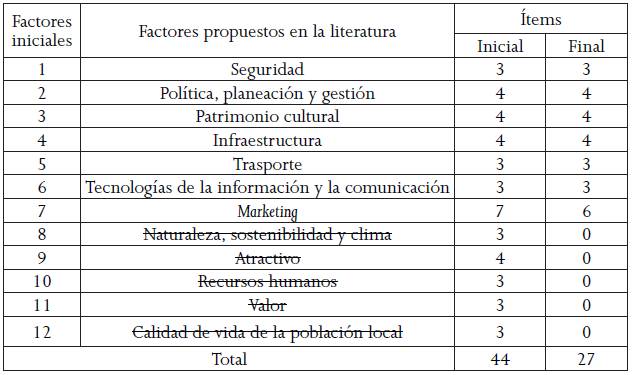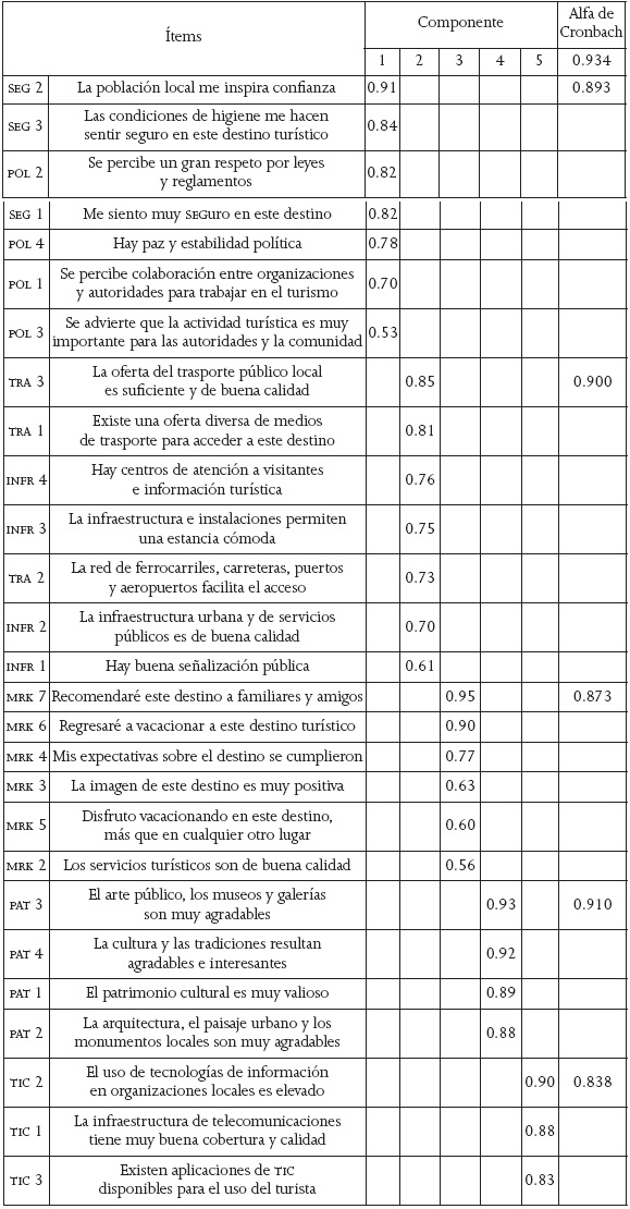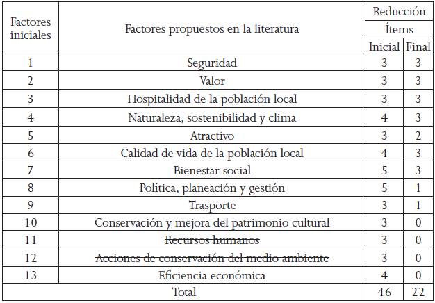 La revisión de la literatura aportó una gran cantidad de factores e indicadores de competitividad turística, derivados de los enfoques adoptados por los autores; por ello se decidió emplear el método de análisis factorial exploratorio, como un procedimiento de reducción de datos, que permite encontrar grupos homogéneos de factores, a partir de un conjunto numeroso de variables. Esos grupos se forman con variables correlacionadas sólidamente entre sí, para buscar que unos sean independientes de otros, para así identificar un mínimo de dimensiones capaces de explicar el máximo de información contenida en los datos, proyectar la estructura interna y simplificarla con menos dimensiones, pero con la misma información (Hair et al. 2006).