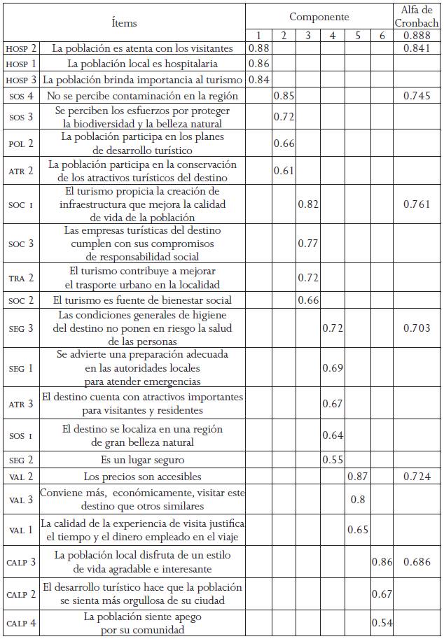 También se incluyó la prueba de esfericidad de Bartlett, con significancia p < .05 y un valor Kayser-Meyer-Olkin de 0.6 o más, para determinar la adecuación de la muestra (Tabachnick y Fidell 2012). En la encuesta a la población residente, 13 de los factores seleccionados por mayor frecuencia de menciones en la literatura académica se redujeron a menos de la mitad; se incluyeron ítems de nueve factores, que se agruparon en seis, y se conservaron 22 de 46 ítems propuestos al principio para la integración de las escalas. En la Figura 3 aparecen los que la población local considera determinantes para la competitividad turística.