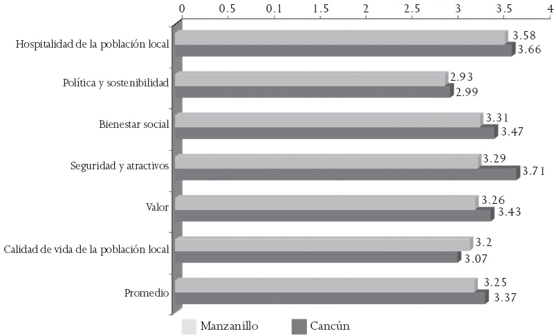Pese a que en la actualidad existe un consenso respecto a que los recursos humanos tienen una relevancia central en el desarrollo de países y organizaciones públicas y privadas, es extraño que en los resultados ninguno de los ítems sobre dicho factor se conservara (véase anexo y Figuras 3, 4, 5 y 7). En ambas encuestas se presentan escalas sobre la calidad de vida de la población local, pero este elemento apenas se conserva en la de los residentes, con resultados superiores en Manzanillo frente a Cancún (véase anexo y Figuras 3, 4, 5 y 7).
