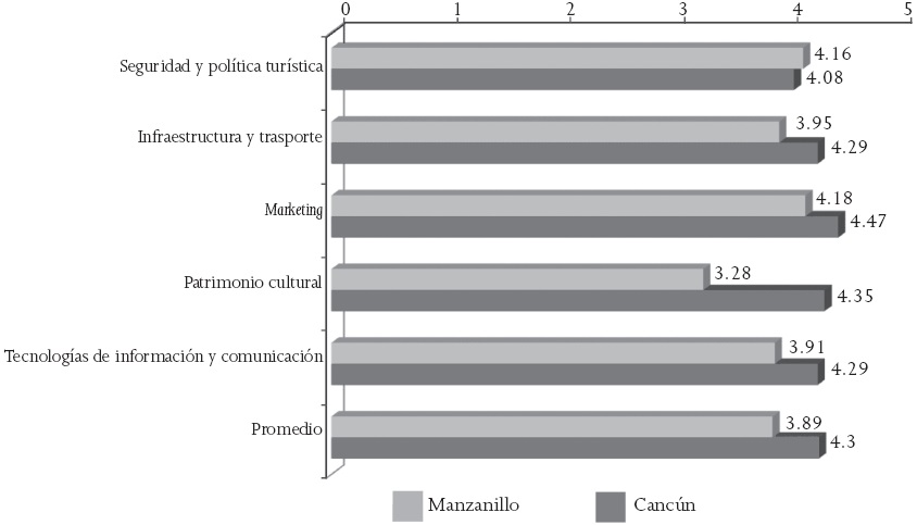 En la encuesta a la población se incluyó una escala sobre trasporte, pero la mayoría de sus ítems se eliminaron, sólo se conservó el de bienestar social, mientras que en la de los turistas permanecieron todos (véase anexo y Figuras 3, 4, 5 y 7), aunque agrupados con infraestructura turística, que también se mantuvieron, con resultados desventajosos para Manzanillo frente a Cancún. Algunos autores consideran determinante la adopción y cobertura de tecnologías de información y comunicación en la competitividad de los destinos turísticos; toda la escala incluida en la encuesta a visitantes se conservó, confirma su importancia; la ventaja competitiva de este factor fue para Cancún sobre Manzanillo (véase anexo y Figuras 7 y 9). En la encuesta a los residentes se incluyó una escala sobre la hospitalidad de la población local, y se conservaron todos los ítems (véase anexo y Figuras 3, 7 y 9), resaltó el hecho de que los encuestados de ambos destinos se perciben como muy hospitalarios.