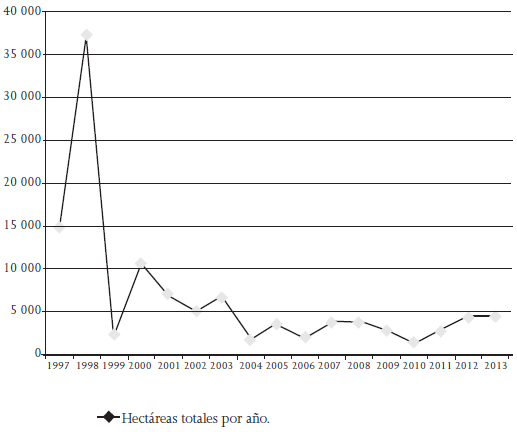 En 1998 se presentaron los mayores incendios en el país y los de La Sepultura fueron grandes; ese año se incendiaron 37 336 ha, de las cuales 80 por ciento fueron superficiales y 20 de copa, sobre todo en bosques de pino-encino (CONANP 2004). Este dato es al menos tres veces mayor que cualquiera de los años anteriores. Tras la gran oleada de incendios, el enfoque de supresión del fuego se reforzó y, antes de llegar a una propuesta para su manejo integral, se trató de aplicar la ley, y mostrar las consecuencias de las quemas que se convierten en incendios. Esto derivó en la implementación, con mayor fuerza, de los programas de control y prevención de incendios pero, sobre todo, de mostrar que en el territorio existía una autoridad que pudiera ejercer la ley. Después de esto, la amenaza sobre el campesino y las que mas se volvió constante y se ejerció de manera presencial en el ANP.