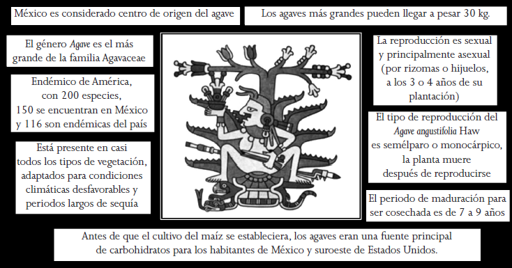 Los ancestros mexicanos utilizaron los vocablos metl o mexcametl, del náhuatl, para nombrar a los agaves, en honor a la diosa Mayahuel. Según la leyenda, el primer agave nació en el lugar donde Quetzalcóatl enterró los restos de la hermosa joven. Los españoles lo llamaron maguey, y en 1753 el naturalista sueco Carl von Linneo, en Species plantarum, lo nombró agave, del griego "admirable" o "noble". En la historia de México el maguey ocupa un lugar preponderante, a tal grado que los antiguos toltecas, zapotecas, mixtecos y mexicas consideraban a esta planta como una deidad (véase Figura 1). Tal importancia estribó en su papel económico, social y cultural, debido a los múltiples usos que se le daba como alimento, bebida, ornato, vestido, calzado, papel, medicina, construcción e instrumento agrícola, entre otros, muchos de los cuales siguen vigentes (Instituto Nacional de Antropología e Historia, INAH 1997; Erowid 2004; García 2007; Puerto y Prudencio 2009; Valenzuela y Gaytán 2011; Comisión Nacional para el Conocimiento y Uso de la Biodiversidad, CONABIO 2012).
