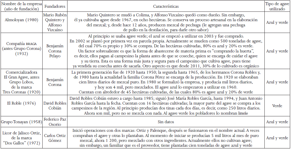 Para 1991, el estado de Jalisco era el principal productor de mezcal del país, en donde la fabricación ya era industrial y se utilizaban procesos químicos controlados en forma precisa (Food and Agriculture Organization, FAO 1991). A raíz de la denominación de origen del tequila en la década de 1970 y la publicación de la norma oficial mexicana NOM-006-SCFI-1994, que establece las áreas geográficas del país permitidas para cultivar agave azul tequilero (Agave tequilana Weber), su monocultivo se expandió en dicha entidad (Núñez 2011). Esto ha ido desplazando al cultivo y producción tradicional del agave verde (Agave angustifolia Haw) en el sur de Jalisco, cambio que se debió al precio atractivo que ofrecían las industrias tequileras por las piñas del agave azul (Puerto y Prudencio 2009).