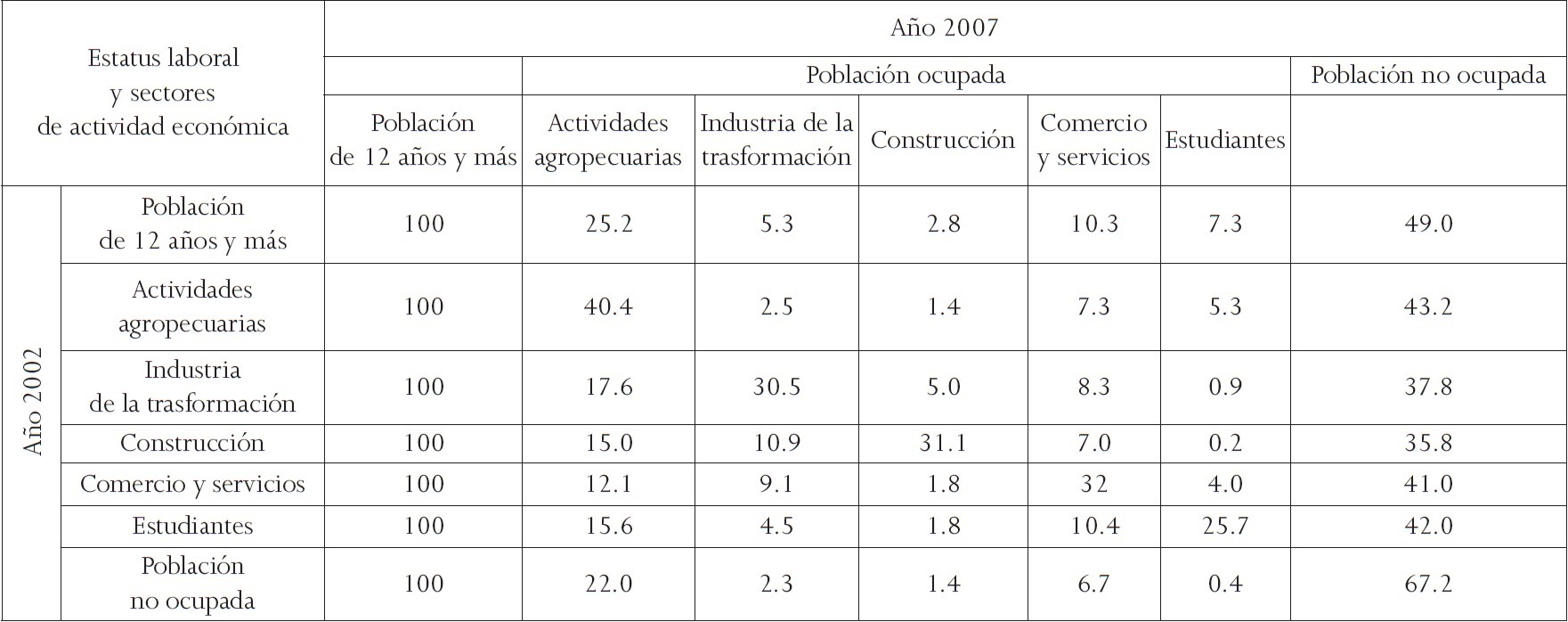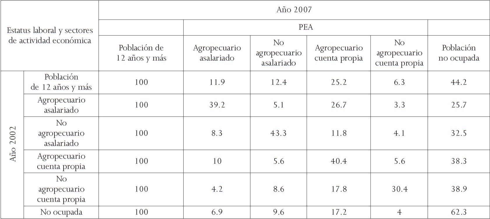 A continuación se presentan estadísticas descriptivas de la participación de la fuerza de trabajo por sector de ocupación, para ello se consideró información de las personas de 12 a 65 años que laboraron en 2002 y 2007. La ocupación principal se determinó con base en las horas dedicadas al trabajo, dividido en: a) por cuenta propia, incluye actividades agropecuarias (agricultura, ganadería y recursos naturales), y no agropecuarias (industria, comercio y servicios) y b) asalariado, que se agruparon igual que las anteriores.