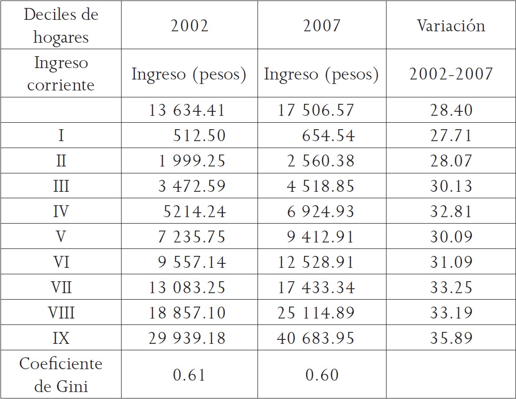 El ingreso promedio trimestral creció 28.4 por ciento en el periodo 2002-2007; los deciles VII, VIII y IX tuvieron los mayores incrementos (véase Figura 12). Para analizar la distribución del ingreso, los hogares se ordenaron de menor a mayor, se agruparon en deciles, de manera que el primero contiene a la décima parte de los de menos ingresos, y el último a los que ganan más. De 2002 a 2007, el ingreso promedio trimestral aumentó en todos los deciles y, respecto a la concentración de éste en ambos años, 2007 tuvo la distribución menos desigual, lo cual indica una ligera reducción del índice de desigualdad del ingreso. Lo anterior coincide con la tendencia nacional, de 0.45 pasó a 0.44, en el periodo 2002-2006, según el informe del CONEVAL (2009).