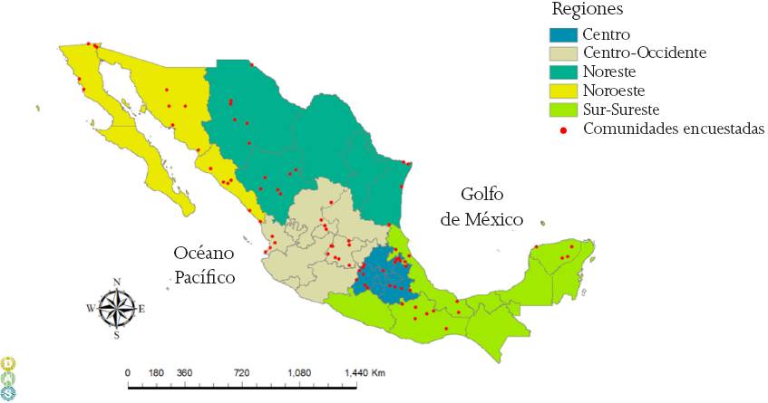 Desarrollo y Alimentación Sustentable A. C. 2015. Distribución regional de la Encuesta nacional a hogares rurales de México y distribución geográfica de las comunidades encuestadas 2002 y 2007. http://das-ac.mx/comunidad-enhrum/enhrum-i-2002/ (2 de septiembre de 2016).