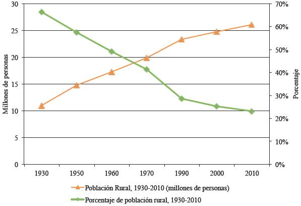 En 80 años se duplicó la población rural en México; de 11 millones, en 1930, pasó a 26.1 millones, en 2010. Hasta la década de 1950 el país era rural, y fue a partir de la siguiente cuando la población urbana superó a la campesina; en 2010, 23.2 por ciento de los habitantes vivía en localidades rurales y 76.8 en urbanas; es decir, menos de una cuarta parte se ubicaba en el campo (véase Figura 2).