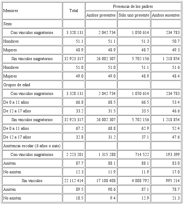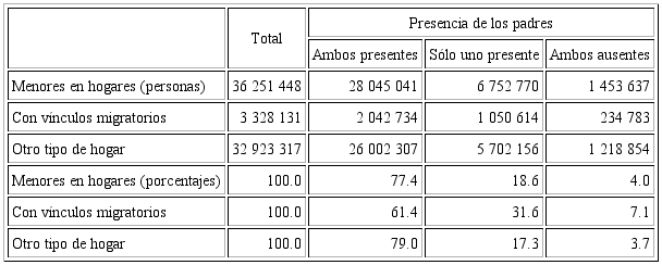 Los datos del INEGI (2011) revelan que de los 28 696 180 hogares que había en México, 18 068 869 (63 por ciento) tenían menores de 18 años entre sus miembros, y en 1 587 811 (8.8) de éstos había vínculos migratorios internacionales. La población objetivo fue de 36 251 448 personas, de entre 12 a 17 años, y 3 328 317 (9.2 por ciento) de ellas vivían en hogares con vínculos migratorios internacionales; en 31.6 por ciento de éstos estaba presente uno de los padres, mientras que los menores que vivían en otro tipo de hogar representaban 17.3 por ciento. Asimismo, 7.1 por ciento de los menores con vínculos migratorios tenían a ambos padres ausentes, y este porcentaje era de 3.7 para quienes residían en otro tipo de hogar (véase Figura 1).