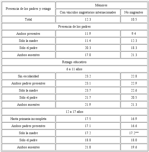 Entre hogares con y sin vínculos migratorios, la inasistencia escolar y el rezago educativo de la niñez seguían siendo altos y poco diferenciados entre ambos tipos de menores; 12.3 por ciento de los vinculados con la migración presentaron inasistencia escolar, y 10.5 quienes no lo estaban. En cuanto al rezago educativo, 23.2 por ciento de los niños de entre 6 y 11 años de los hogares con vínculos migratorios lo presentaban, en comparación con 22.8 de los que residían en hogares sin estos vínculos.