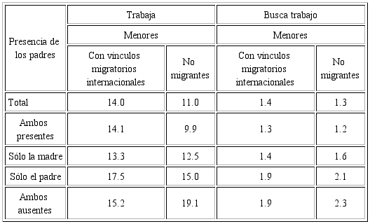 La intensidad del trabajo infantil fue más alta en los menores con vínculos migratorios, 14 por ciento versus 11. Aunque es necesario señalar que la ausencia o la presencia de ambos padres mostró situaciones contrastantes entre los de ambos tipos de hogares.