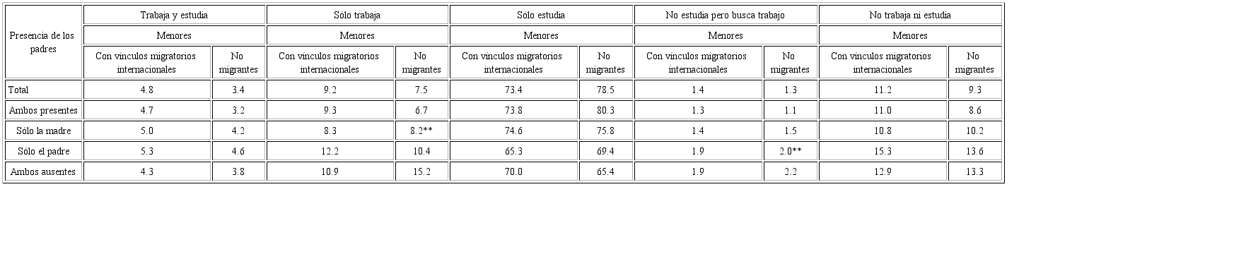 La condición laboral de los jóvenes de 12 a 17 años pone de manifiesto la necesidad de sus familias de contar con un ingreso adicional; fue mayor la proporción de los que trabajaban y pertenecían a hogares con vínculos migratorios, que la de quienes vivían en hogares de no migrantes. Sin embargo, hubo contraste ante la presencia o la ausencia de ambos padres (véase Figura 4).