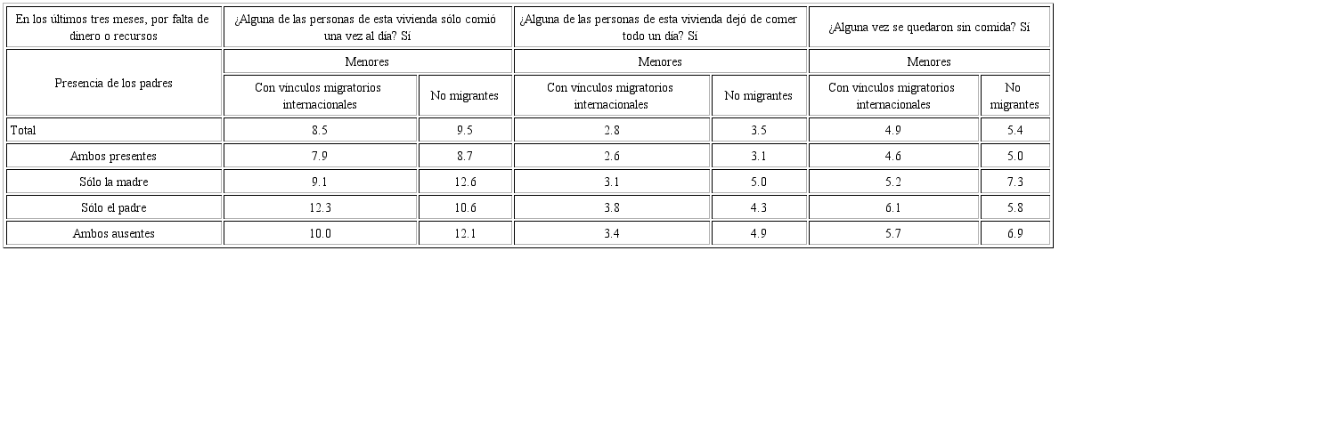 Sigue presente la carencia de alimentos o situación de hambre que vive la niñez en muchos hogares mexicanos, aunque fue menor en los niños con vínculos migratorios (8.5 por ciento), que en los que no los tenían (9.5).