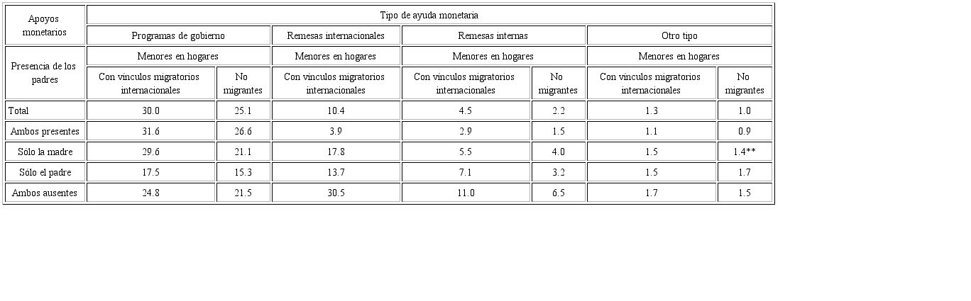 Es importante destacar que en estas investigaciones no se realiza un análisis a profundidad del efecto de la ausencia de uno o de ambos padres en los hogares estudiados. Dicho factor es relevante puesto que puede ser benéfico o perjudicial para la asistencia escolar, el logro educativo y la inserción en el mercado laboral de los niños y jóvenes. Por ejemplo, se puede suponer que si un padre está ausente los jóvenes pudieran seguir estudiando, si éste les proporciona los recursos monetarios para el sostenimiento del hogar, para que a su vez la estructura familiar no les demande que trabajen, para compensar la ausencia del padre. De lo contrario, cuando el padre no está y el dinero es insuficiente, el joven tendría que laborar, y abandonar la escuela. No obstante, es importante señalar que este factor es uno de los muchos que inciden en la inserción y permanencia escolar de los menores y los jóvenes con vínculos migratorios internacionales.