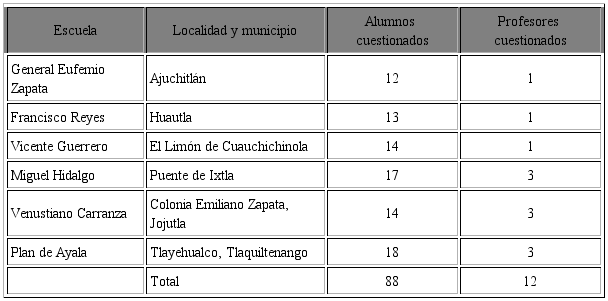 En Puente de Ixtla existen 12 primarias, se seleccionó a la “Miguel Hidalgo”, que tiene 239 alumnos (33 en 4° grado, 35 en 5° y 54 en 6°) y diez profesores; en Jojutla hay 32 primarias, se analizó la “10 de Abril”, con 391 estudiantes (69 en 4° grado, 66 en 5° y 70 en 6°) y 17 profesores; y en Tlaquiltenango son 33 primarias, se eligió la “Plan de Ayala”, que tiene 306 alumnos (39 en 4° grado, 58 en 5° y 55 en 6°) y 14 profesores (véase Figura 2).