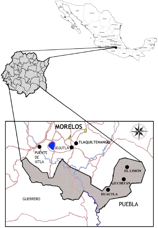 Cada localidad se analizó por separado, y las estudiadas están en cuatro municipios de Morelos: Jojutla (Colonia Emiliano Zapata), Puente de Ixtla (Colonia Centro), Tepalcingo (El Limón de Cuauchichinola) y Tlaquiltenango (Ajuchitlán, Huautla y Tlayehualco) (véase Figura 1). Las comunidades rurales se encuentran dentro de la REBIOSH y fueron: Ajuchitlán, El Limón de Cuauchichinola y Huautla; se escogieron por ser tres de las diez en las que la UAEM ha tenido mayor presencia; en El Limón tiene una estación biológica. Las localidades urbanas fueron Jojutla, Puente de Ixtla y Tlayehualco, del municipio de Tlaquiltenango, están fuera de la REBIOSH; se eligieron por ser las tres urbanas más grandes en el entorno de la reserva. Las escuelas de El Limón y Ajuchitlán son de carácter “multimodal”, donde un profesor trabaja con todos los grados escolares.
