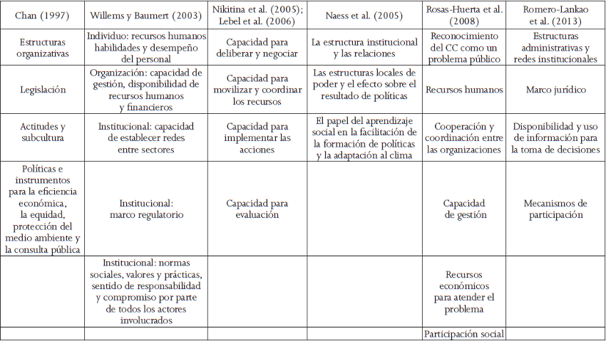 La CI requiere de la participación, cooperación y coordinación integral de actores que pertenecen a entidades públicas del ámbito local, regional y nacional, así como del sector privado, la sociedad civil y organismos internacionales (Adger et al. 2005, 79). Por esta complejidad y la carencia de una definición, son escasos los trabajos orientados a evaluar a las instituciones y establecer si cuentan con capacidad para diseñar y aplicar políticas para la resolución de problemas públicos, y determinar su capacidad de movilización y adaptación para afrontarlos (Rosas-Huerta 2008, 120).