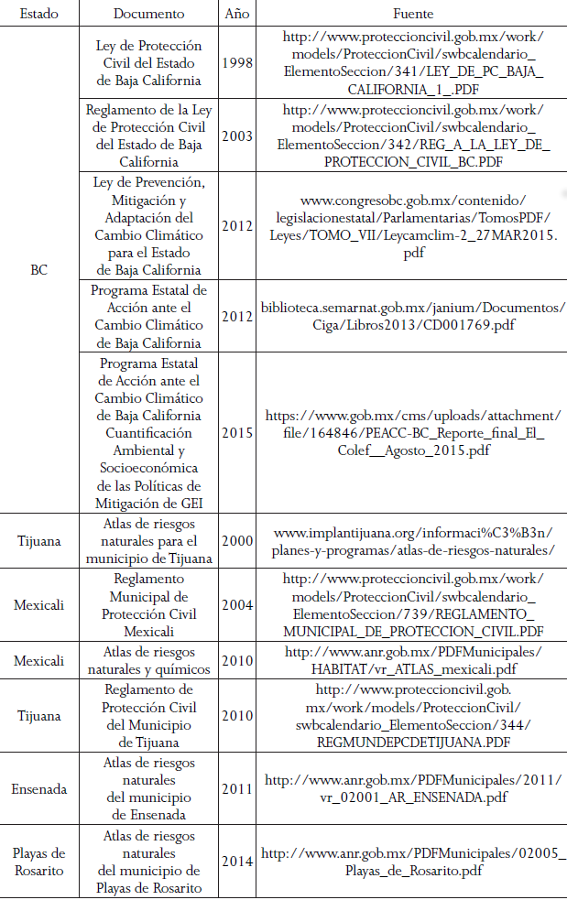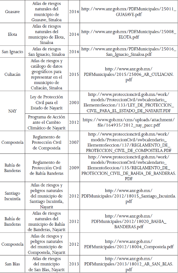 Si se considera que la respuesta inmediata se encuentra en manos del municipio, es importante revisar la política local que regula esto. Como se mencionó antes, los atlas de riesgos están reconocidos de manera oficial dentro del marco legal, como instrumentos de ordenamiento territorial y de prevención de desastres, en particular en los gobiernos locales, en el contexto de una descentralización parcial del esquema de protección civil en el país (Ruiz et al. 2015, 148). Con escasas excepciones, como SON, hoy se cuenta con este instrumento en casi todos los municipios costeros del noroeste de México,1 en tanto que los ordenamientos municipales aún son muy limitados. Con respecto a la legislación estatal, en la región hay programas estatales de cambio climático y está la Ley de Protección Civil, aunque sólo BC cuenta con Ley de Cambio Climático publicada. Algunos municipios de BC y NAY tienen un reglamento de protección civil propio, y también existen algunos planes que se activan durante alguna época del año, como el de la temporada invernal y el de la temporada de lluvias y ciclones tropicales (véase Figura 3).