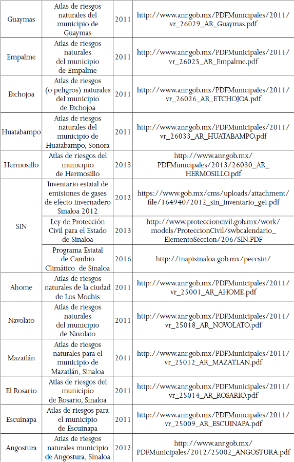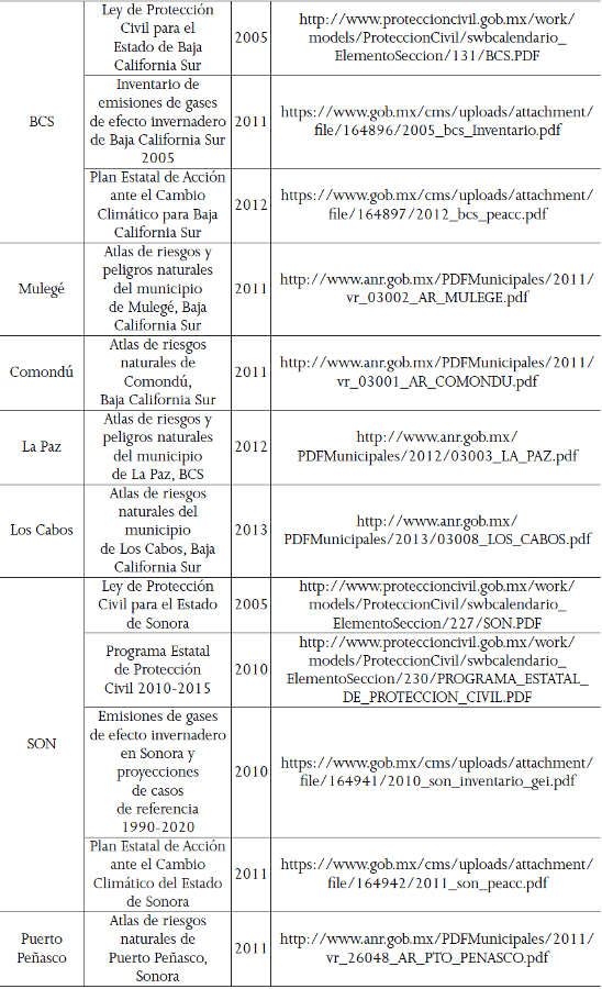 Aunque en la mayoría de los casos la información se trasfiere del ámbito nacional al estatal y local, las universidades y centros académicos locales son generadores de conocimientos y experiencias en los que se apoyan los gobiernos municipales y estatales (Romero-Lankao et al. 2013b, 130); por ejemplo el Sistema Nacional de Protección Civil lo hace en el CENAPRED, el cual realiza actividades de investigación, capacitación y difusión acerca de fenómenos que pueden originar situaciones de desastres, para coadyuvar a una mejor preparación de la población para enfrentarlos. En 2012, la Subdirección de Riesgos Hidrometeorológicos del CENAPRED publicó el informe Mapas de índices de riesgo a escala municipal por fenómenos hidrometeorológicos, en donde se presentan mapas específicos por fenómeno para cada municipio, e incluye un índice de vulnerabilidad social. En BC, BCS y SIN se identifican municipios con un riesgo alto y muy alto por la presencia de ciclones tropicales. A partir de la publicación de la Ley General de Cambio Climático (2012), el Instituto Nacional de Ecología se trasformó en el Instituto Nacional de Ecología y Cambio Climático, cuya misión es generar e integrar conocimiento técnico y científico para la mitigación y adaptación al CC. Esta institución trabaja en varios proyectos, en coordinación con diversos actores del sector gubernamental, académico y sociedad civil, en algunos casos se incluye a organismos internacionales.