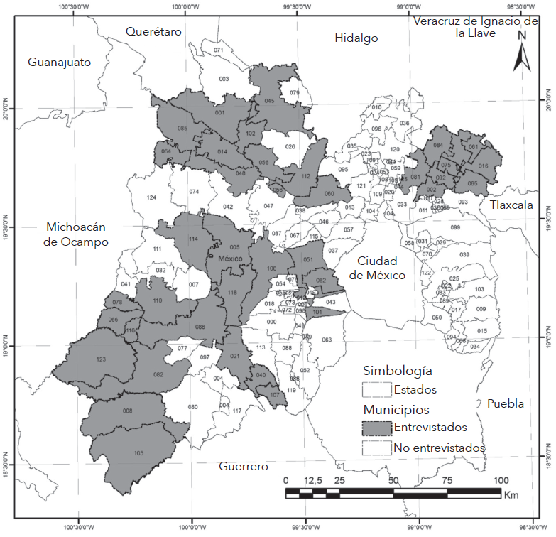 Se realizaron 334 entrevistas a profundidad, con migrantes internacionales retornados a 37 municipios rurales y urbanos del Estado de México; todos ubicados mediante la técnica bola de nieve y redes de amistad. El trabajo de campo se efectuó entre diciembre de 2012 y febrero de 2013. La guía de entrevista inquirió sobre sus procesos de migración, las condiciones de vida que tenían antes y al retorno (vivienda, actividades productivas, ingreso, opciones laborales), los motivos de éste, la adquisición de conocimientos laborales y su calidad, el uso que les dan al volver, los activos físicos y productivos que acumularon. Se delimitó como migrante de retorno a la persona mayor de 15 años, que por lo menos estuvo un año continuo en Estados Unidos por motivos laborales, y que al momento de la entrevista tenía una estancia mínima de tres meses en su localidad. Otras delimitaciones1 incluyen personas de menor y mayor edad, con y sin motivos laborales, pero en esta investigación la idea fue captar migrantes que hubieran experimentado aprendizaje laboral y que al retorno ya estuvieran descansados, para que sus testimonios fueran más claros, que si se les entrevistara cuando estuvieran recién llegados.