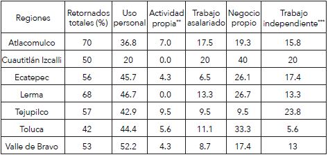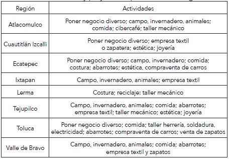 También es notable que en todas las regiones de la entidad los retornados manifiestan interés en desarrollar proyectos productivos y sociales. La idea de poseer un negocio a futuro se concentra en Atlacomulco, Cuautitlán Izcalli, Ecatepec y Toluca. La intención de criar animales, establecer invernadero y huertas, destaca en Atlacomulco, Ecatepec, Ixtapan, Tejupilco y Valle de Bravo, cuya vocación es agrícola, aunque en Ixtapan y Valle de Bravo hay turismo. Las intenciones de abrir negocios de comida se concentran en Atlacomulco, Ecatepec, Tejupilco, Toluca y Valle de Bravo, que poseen industrias, comercio y turismo (véase Tabla 6).
