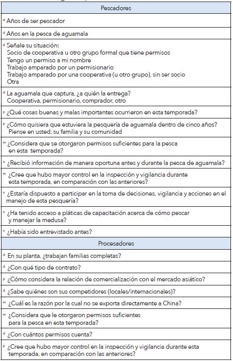 Las preguntas se diseñaron para conocer el desempeño, manejo y nivel de participación de los pescadores y otros actores, así como sus percepciones sobre el estado actual de la pesquería y la importancia que le otorgan (véase Tabla 1). En julio de 2016, en Guaymas y Las Guásimas, Sonora, se entrevistó a 94 personas: 45 pescadores, 26 despiñonadoras2 de las plantas deshidratadoras, 10 dueños de procesadoras y cuatro de sus técnicos, tres de CONAPESCA, cuatro investigadores y dos compradores intermediarios.