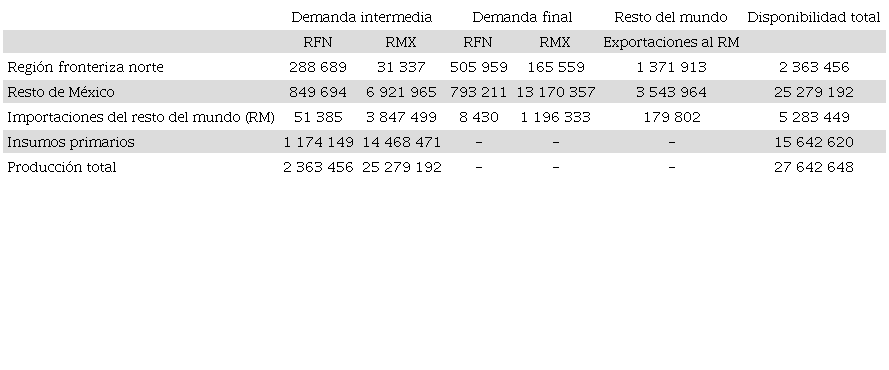 En la Tabla 1 se presenta la estructura fundamental y los valores del modelo birregional: RFN y resto de México (RMX). Cada elemento de la tabla está identificado por su pertenencia a una fila y a una columna de la misma, las filas indican el origen de las mercancías y las columnas el destino. Además aparecen en el mismo, el flujo de exportaciones e importaciones del resto del mundo, insumos primarios y producción total.