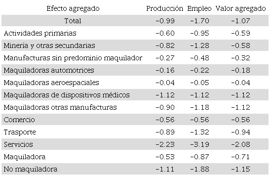 El modelo insumo-producto ampliado a precios y construido para la región fronteriza norte muestra los siguientes impactos económicos. Los efectos negativos esperados para la producción bruta son de -1%, en el personal ocupado, de -1.7%, y en el valor agregado, de -1.07%.