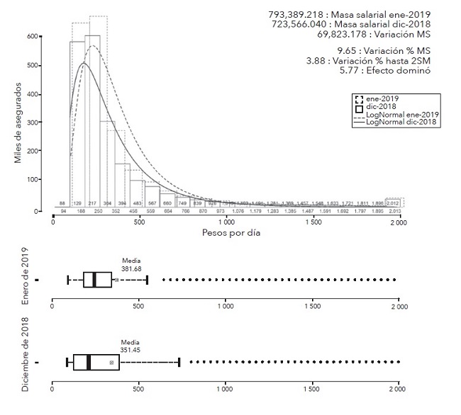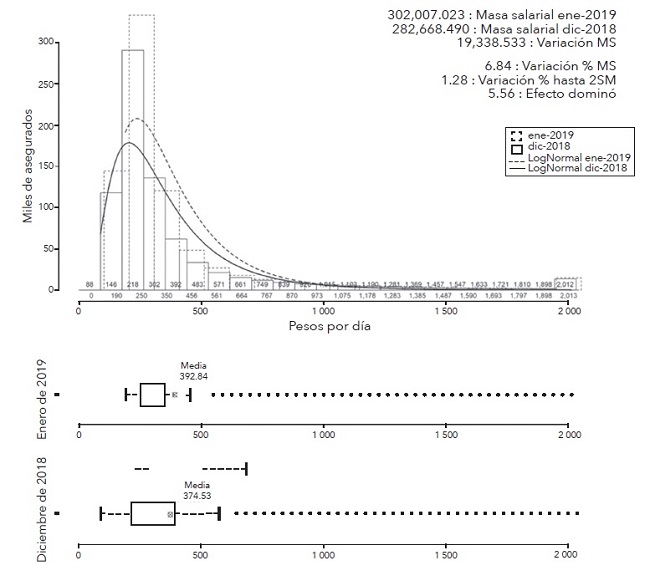 Para calcular el efecto dominó se usaron los datos del IMSS entre los meses de diciembre de 2018 y enero de 2019. En las Figuras 2 y 3 se muestran, para IMMEX y el resto de los sectores de la RFN, las distribuciones de los asegurados del IMSS por niveles de SMF entre las dos fechas anteriores. En ellas se aprecia un desplazamiento de la distribución de enero de 2019 hacia la derecha, lo que implica un incremento en los niveles de ingresos de las personas que ganaban menos de dos salarios mínimos diarios. Este desplazamiento hacia mayores niveles de ingreso se combina con una distribución más compacta en términos de su amplitud, como se aprecia en las figuras de “cajas y bigotes” debajo de la gráfica de barras.