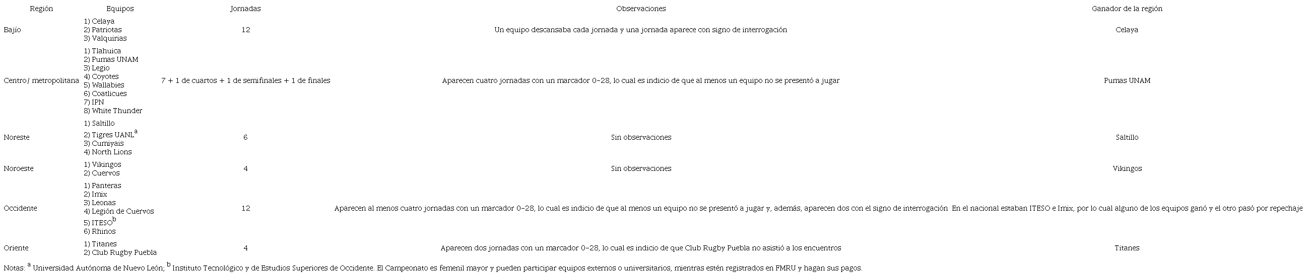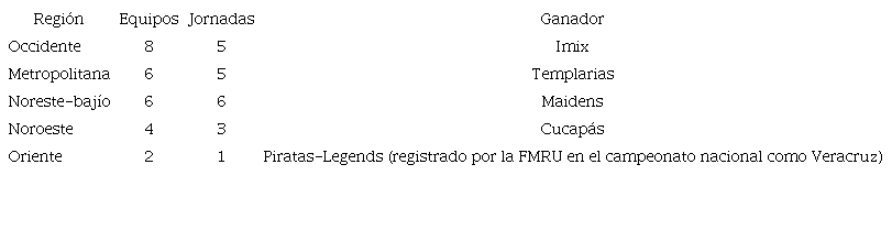 Los resultados oficiales de este torneo, publicados por la FMRU, indican que no se inscribió ningún equipo en la región sureste y, por lo tanto, pasaron dos equipos del repechaje a la fase nacional. Las características de la fase regional se observan en la Tabla 4.