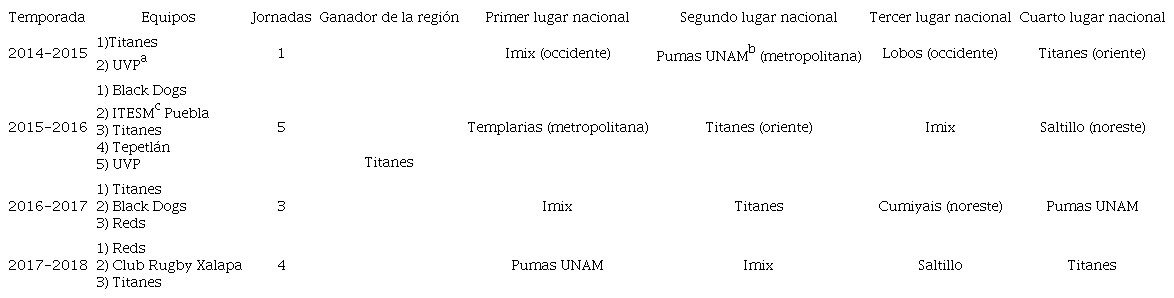 Se jugó una primera versión del campeonato en la región metropolitana en la temporada 2012-2013 y un torneo regional en bajío y centro (FMRU, 2020d), y a nivel nacional se juega a partir de 2013 (FMRU, 2020h). Al principio, en la temporada 2013-2014, existían cinco regiones: occidente, metropolitana, noreste-bajío, noroeste y oriente. Después, de 2014 a 2015 se contaba con seis regiones, debido a que la noreste-bajío se dividió en dos. De 2015 a 2016 existían siete: noroeste, noreste, bajío, occidente, oriente, centro y sureste. Esta última regionalización es la que persistió en las siguientes temporadas. La última que se jugó en el formato seven fue la de 2015-2016 (FMRU, 2020a). No debe omitirse que sólo se ha tenido acceso a los anexos técnicos de las temporadas de 2015 a 2018 (FMRU, 2020g). En la temporada 2013-2014 aparecen cinco regiones con las características señaladas en la Tabla 1.