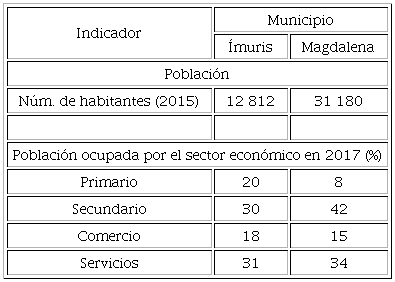 En ambos municipios predominan las actividades económicas comerciales y de servicios, además de las prácticas industriales, mineras, agrícolas y ganaderas (Corella, 2010; Secretaría de Agricultura, Ganadería, Desarrollo Rural, Pesca y Alimentación [SAGARPA], 2017). Otro rasgo distintivo es su cercanía a la frontera con Estados Unidos, lo que también le permite proyectar sus alimentos artesanales a los mercados de la nostalgia del vecino país, tanto por las peregrinaciones como por ser un lugar de paso obligado para muchos viajantes que transitan por la Carretera Federal 15. Los principales datos socioeconómicos del territorio se presentan en la Tabla 1.
