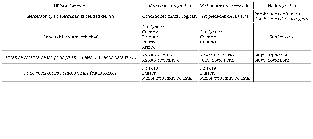 Las UFPAA medianamente integradas (13) se dedican a la elaboración tanto de CF como de CM. Participan en la transformación y en la comercialización de alimentos artesanales. No producir la fruta les da la flexibilidad de adquirirla en distintos lugares de la región o en regiones vecinas. Pueden elaborar diversos productos y distribuirlos en distintos puntos de venta y tiendas de productos regionales, en particular de Magdalena de Kino. Constituyen el grupo social más numeroso, lo cual era de esperarse en la medida en que, como se verá más adelante, la producción local de frutas es mínima. En este grupo también se registra la mayor diversidad de alimentos artesanales.