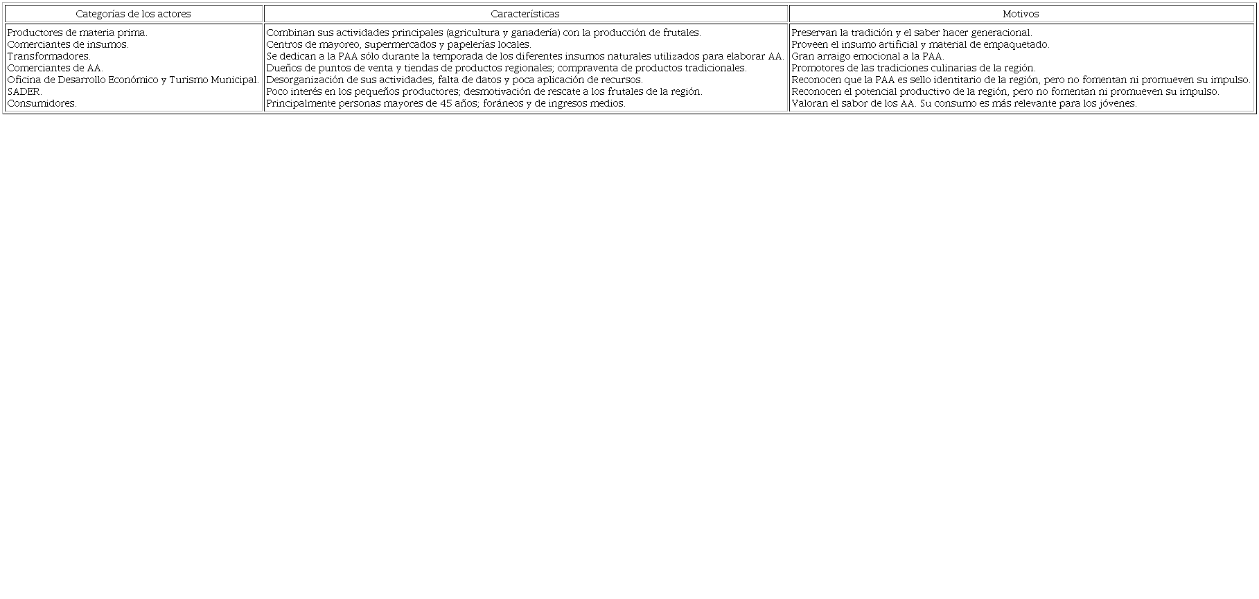 El estudio se enfocó en dos AA. La cajeta de membrillo, nombre que se le dio en la región a un dulce derivado de la pulpa del membrillo y azúcar, cocido con leña de mezquite, cuyo proceso dura alrededor de 3.5 horas. Su presentación tradicional es en bloques de 250 gramos, más o menos, envueltos en papel de celofán transparente. Y las conservas de frutas (frutas en almíbar, jaleas y mermeladas) están elaboradas con durazno, chabacano e higo, envasadas en frascos de cristal con capacidad de entre 250 y 1 000 mililitros (ml). Su procesamiento varía dependiendo del tipo de conserva; su base es el cocimiento de la fruta y posterior adición de almíbar. Ambos procesos son representativos de la región y se consideran el resultado de prácticas ancestrales de conservación de frutas cosechadas en el territorio mediante la adición mínima de ingredientes externos y conservadores artificiales, lo cual demuestra el conocimiento antiguo sobre la elaboración y la transformación de alimentos (Camacho et al., 2019; Ortega, Vásquez, Flores y Núñez, 2017). Dicho saber hacer -traducido a prácticas productivas, de transformación, de conservación y de empaquetado para su venta- se conjuga con elementos propios del ecosistema del territorio para configurar la tipicidad de los productos identificada por las UFPAA. A continuación, se destaca la relevancia del insumo principal (frutas), producido en la localidad que asegura la tipicidad de los AA, según las opiniones de las UFPAA (véase Tabla 2).