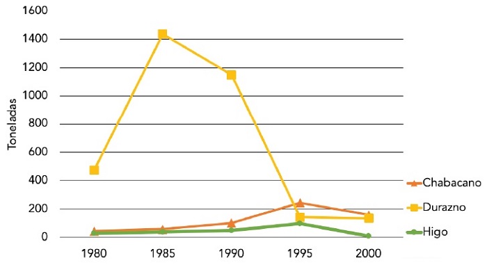 Por otro lado, las UFPAA también coincidieron al reconocer que su desafío primordial es la escasez de fruta producida en la localidad, su principal materia prima. Como se constató con base en las estimaciones de las series de producción (véanse figuras 4 y 5), la región de estudio experimentó un marcado descenso en su población de frutales. Los actores locales que participaron en el estudio atribuyeron esta situación a la escasez de agua y a la recurrencia de enfermedades que afectaron plantaciones cuyos antecedentes datan de la llegada de los misioneros jesuitas a la región. Empero, no señalaron la apertura comercial ni los cambios en las políticas para el campo que orientaron las subvenciones y los apoyos hacia los cultivos de exportación -sucesos que coinciden en el tiempo con la desaparición casi total de las huertas regionales-. Sólo uno de los informantes hizo referencia al desplome de los precios de la fruta pero como hecho aislado, sin injerencia en el derrumbe de la producción frutícola.
