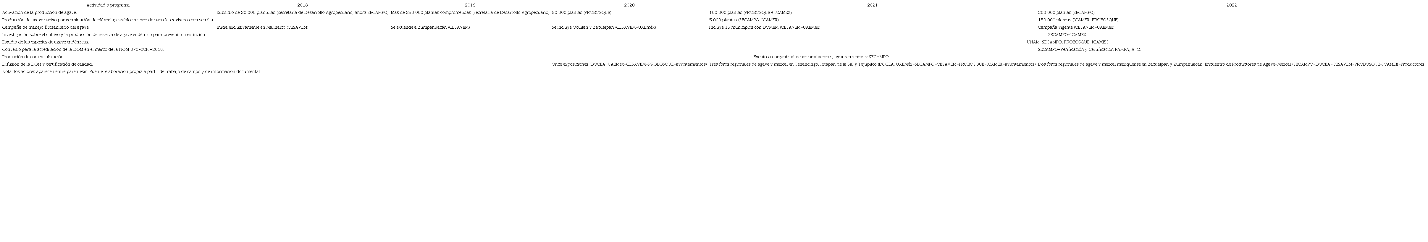 Activación de producción de agave. Una vez que se publica la ampliación de la DOMEM en 2018, el gobierno apoya con plántulas de agave, incentivos agropecuarios y con financiamiento parcial para la construcción de fábricas de mezcal, sobre todo en Malinalco, Zumpahuacán, Zacualpan, Luvianos, Tonatico, Ixtapan de la Sal y Coatepec Harinas (Mazo, 2020).