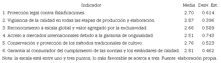 La percepción sobre la protección legal contra falsificaciones del producto es aceptable en beneficio tanto de los productores, como de los consumidores. De acuerdo con la normatividad, para alcanzar los beneficios de la DOM, es preciso avanzar también en el control de la calidad.