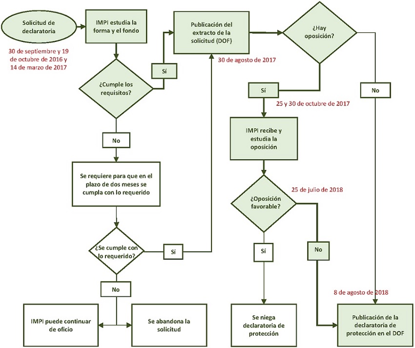 El procedimiento de funcionamiento de una DO consta de siete etapas (IMPI, 2017; Organización Mundial de la Propiedad Intelectual [OMPI], 2011). En la primera se elabora y se presenta la solicitud mediante escrito libre, anexos de apoyo y pago de las cuotas respectivas para que el IMPI examine la forma y el fondo. Si se cumplen los requisitos que exige la Ley Federal de Protección a la Propiedad Industrial (LFPPI) (Cámara de Diputados del H. Congreso de la Unión, 2020a), el IMPI publica un extracto de la solicitud en el DOF (segunda etapa) con la finalidad de identificar y, en su caso, analizar oposiciones para resolver (o no) la declaratoria de protección (tercera etapa). Después, para garantizar la calidad del producto final, se elabora la NOM o se da cumplimiento a ella. En la quinta etapa, un OEC verifica, evalúa y, en su caso, certifica a quienes acatan la normatividad. La certificación de calidad es indispensable para que el IMPI autorice el uso de la DO (sexta etapa) y el producto pueda comercializarse en el país y en el extranjero bajo el emblema “Denominación de origen protegida” (séptimo paso).