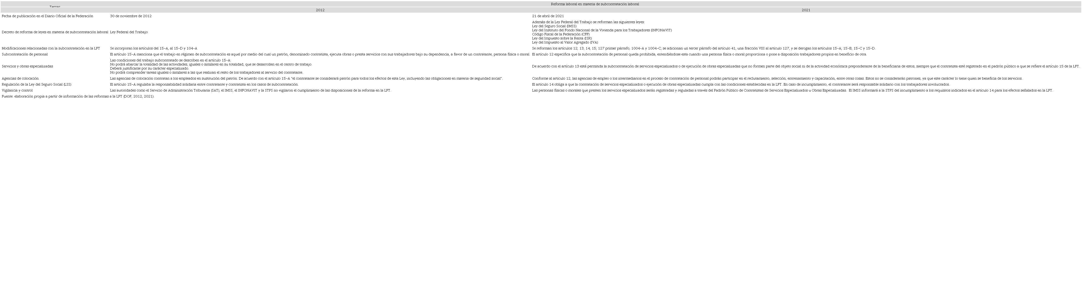 En este sentido, la reforma a la LFT de 2021 prohíbe la subcontratación de personal y establece reglas precisas para contratar únicamente la prestación de servicios o la ejecución de obras especializadas, con la finalidad de erradicar las prácticas ya mencionadas. En la Tabla 1 se muestra un comparativo de ambas reformas.