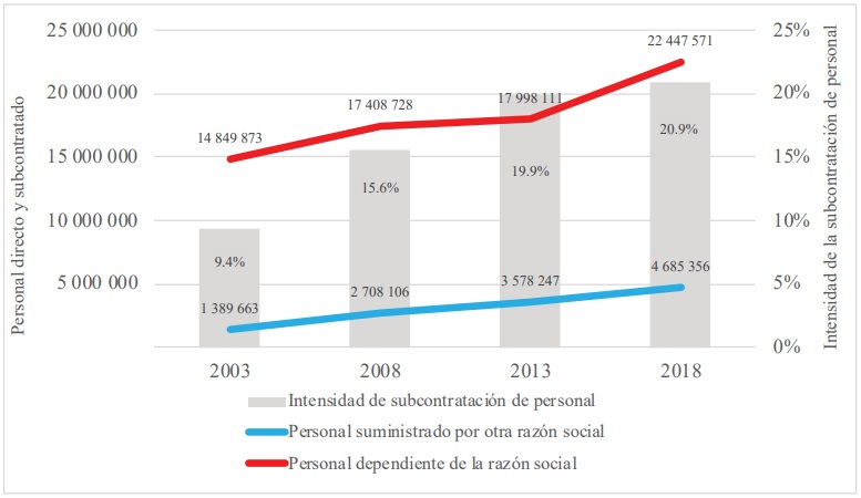 La idea más notoria que expresan los datos es que las modificaciones de 2012 a las leyes no parecen haber tenido un impacto numérico significativo en la subcontratación laboral. Al mismo tiempo, es importante el hecho de que la tendencia al alza se haya interrumpido, incluso que vaya un poco a la baja a partir de 2012.
